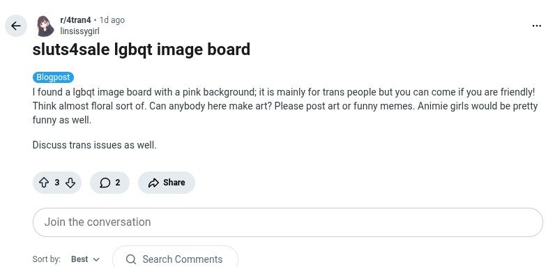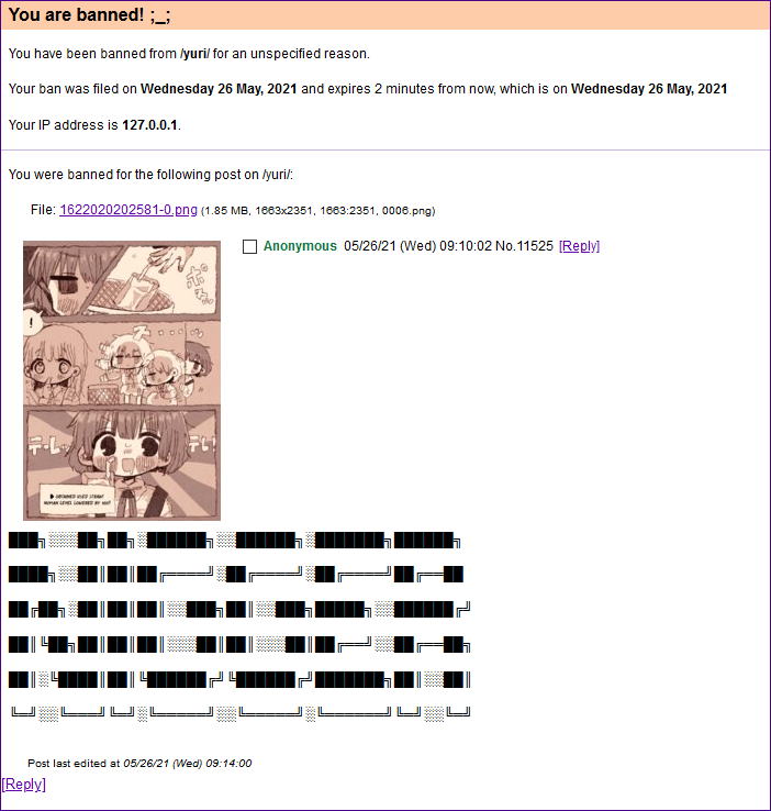 This is a fun one since it was simply bootyblasting over calling out the discord shitmin that took over from the discord shitmin that took over from the moderator of the rando board on this queerbaby hellsite. The actual inciting posts were in a dedicated meta thread where they were supposed to be and I was responsible for like 20% of the productive content on the board at the time lol
