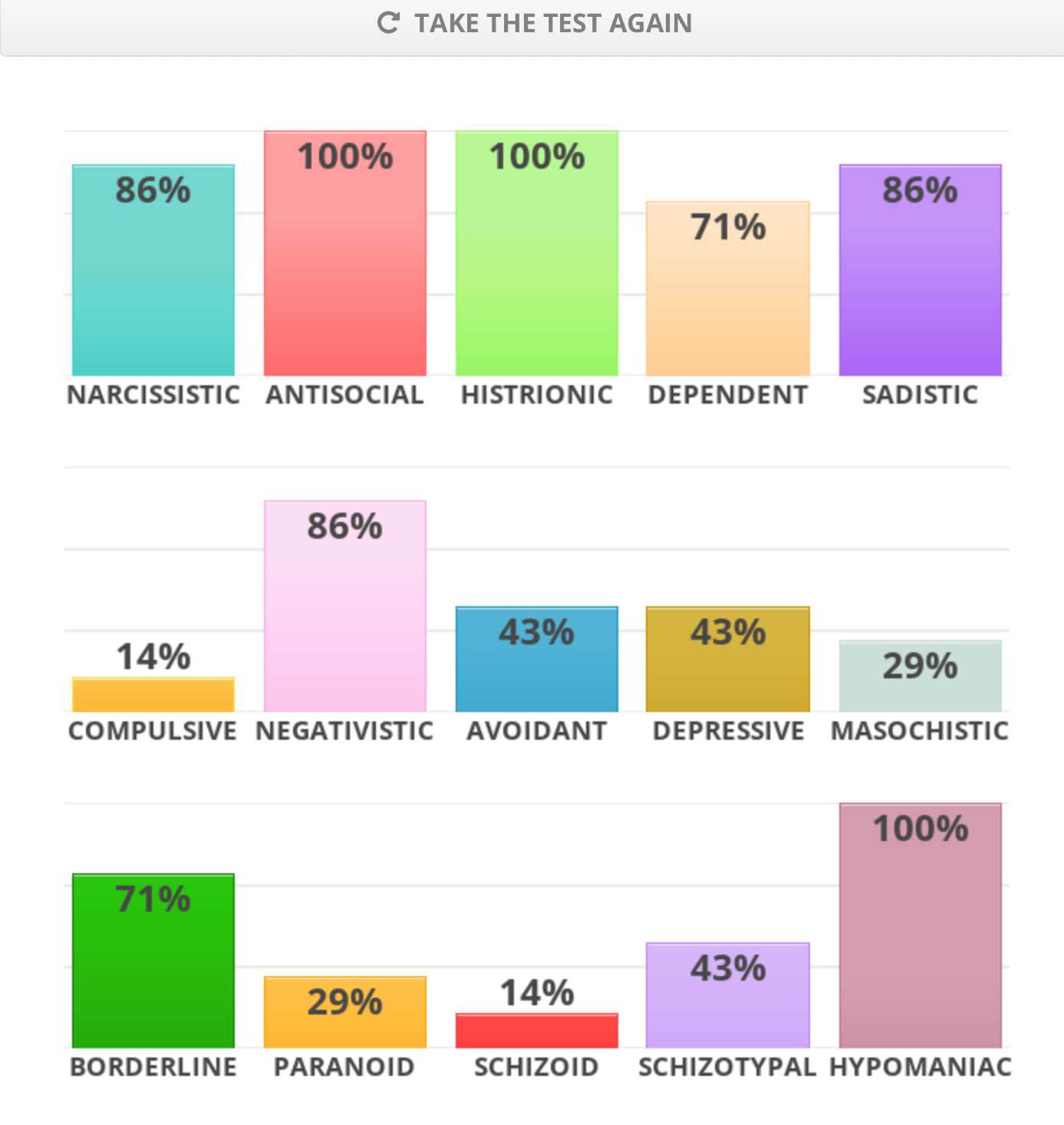 Imagine taking a test where the results are actually a surprise to you, I already know I'm schizoid and just all around distrustful of strangers.