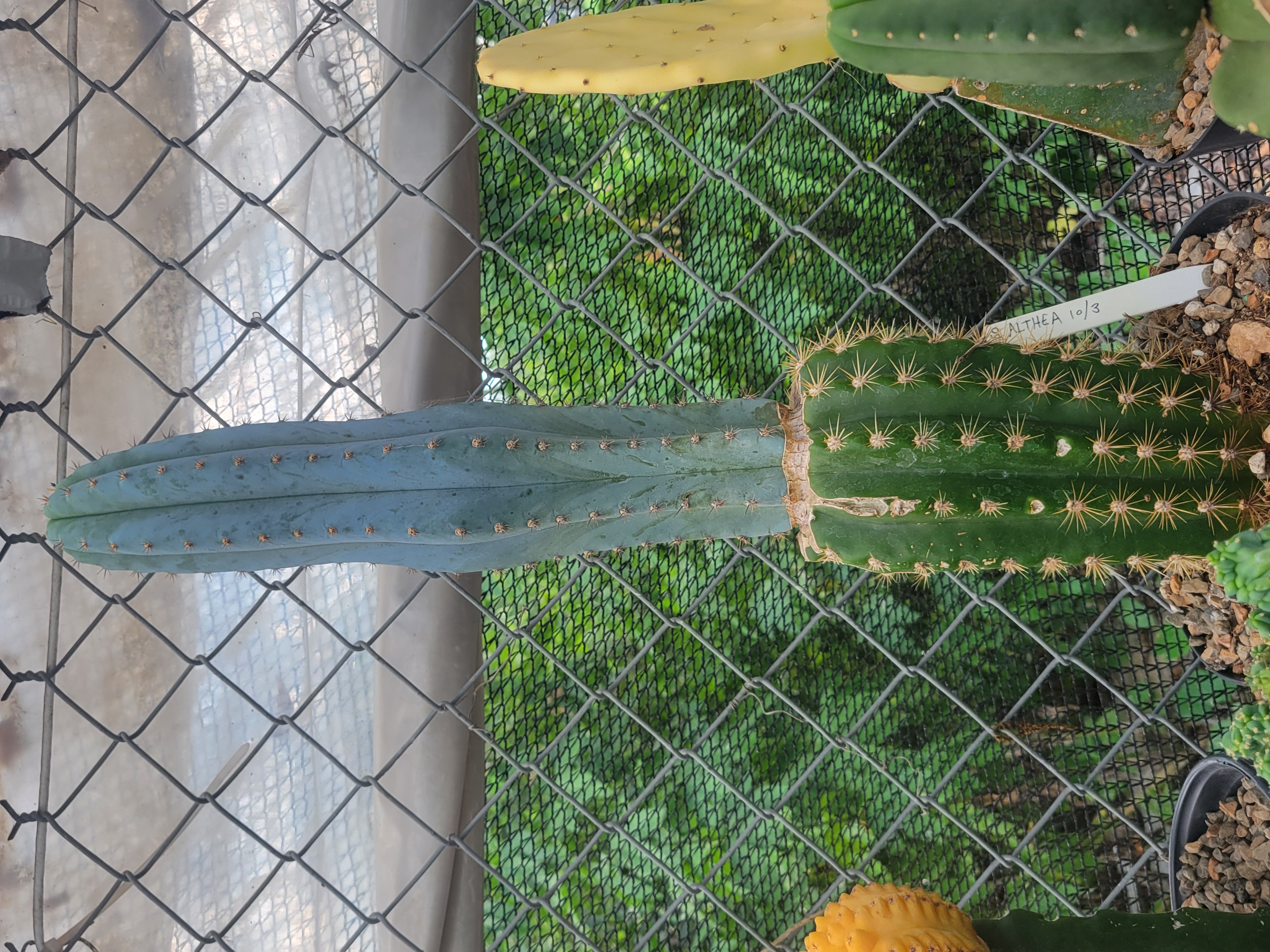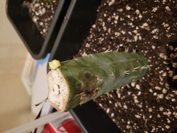 moved it inside for now because it can rot from excessive rainfall (the root system isn't very established yet). and the new tip is discolored from a lack of light, it grew when I stored the stump in a dark area.