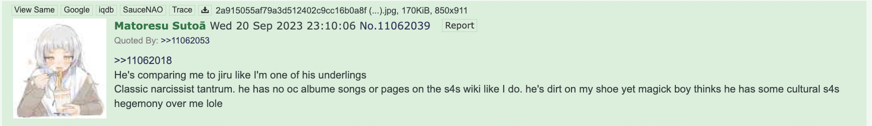 https://archive.4plebs.org/s4s/thread/11040467/ https://archive.4plebs.org/s4s/thread/11036585/ https://archive.4plebs.org/s4s/thread/11033107/ https://archive.4plebs.org/s4s/thread/11030075/ https://archive.4plebs.org/s4s/thread/11029496/ https://archive.4plebs.org/s4s/thread/11011119/ https://archive.4plebs.org/s4s/thread/11061683/ https://archive.4plebs.org/s4s/thread/11052368/ https://archive.4plebs.org/s4s/thread/11042767/ These are all from the last month. How is this 'barely acknowledging me', this is obsession.