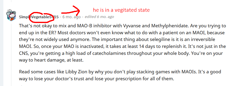 nothing just seligiline, sometimes some methamphetamine if i felt a bit drowsy and 220mg caffeine every 10 hours or so since i reset my tolerance, by the way i had to go to school yesterday and i stumbled hard on the ground while walking i thought that was funny. also i havent eaten for 4 days