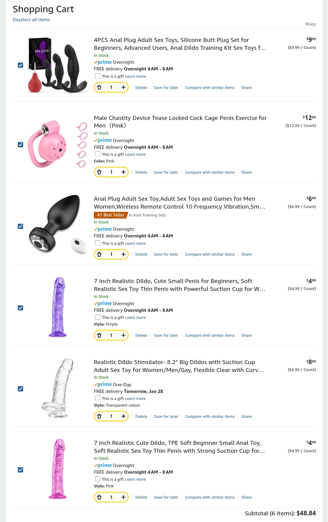 I've bought the 7" TPE dildo from this brand before so I know they're good, they're a nice size for felating but too narrow and long for going in ur butt, it just goes way past the p spot, the cage has a bunch of ring sizes and I really wanna try one of those passive aneros toys that just touches your p spot ✨✨💸