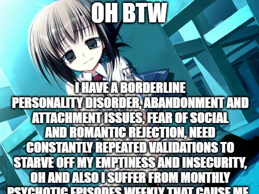 She was a huge weeb like me though, she called me her senior (her senpai), I can very much say that being with a bpd girl is very much not cute 85% of the time, but some of it is kinda cute, mostly not cute!